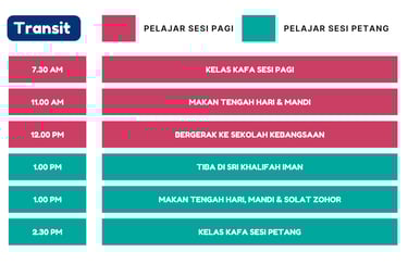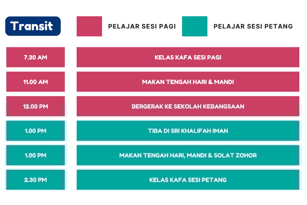 Perkhidmatan ini merangkumi pengangkutan anak-anak dari atau ke SRI Khalifah Iman dan Sekolah Kebangsaan terpilih di kawasan sekitar. Bagi murid sesi petang, mereka akan dihantar ke sekolah selepas transit di SRI Khalifah Iman, manakala bagi murid sesi pagi, mereka akan dijemput dan ditempatkan di pusat transit kami selepas tamat sesi persekolahan.